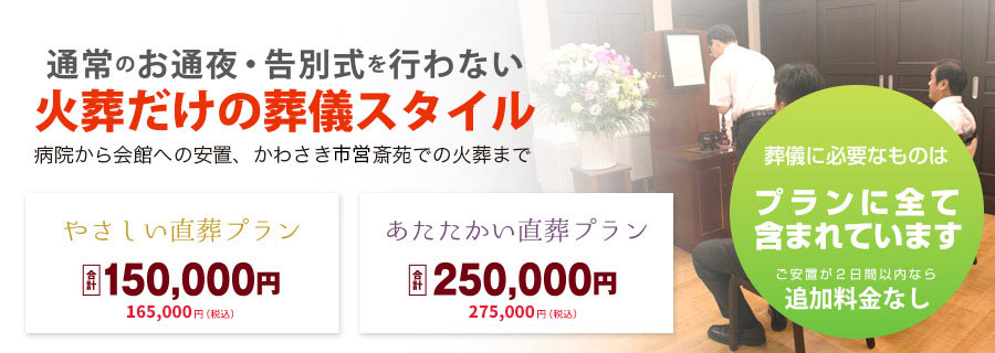 198,000円 (税込)火葬のみで故人様をお見送り。病院から会館への安置、かわさき市営斎苑での火葬まで。安置日が2日以内であれば、プラン料金以外の追加料金はかかりません。